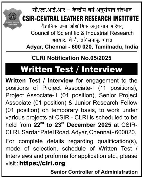 The CSIR–Central Leather Research Institute (CLRI), Chennai, invites applications from eligible candidates for various project-based research positions. Interested applicants may attend the Walk-In Written Test / Interview as per the schedule given below.