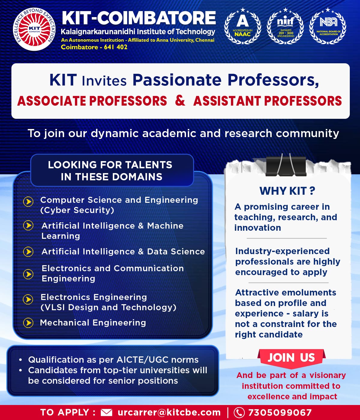 Hiring Organization: Kalaignarkarunanidhi Institute of Technology (KIT), Coimbatore