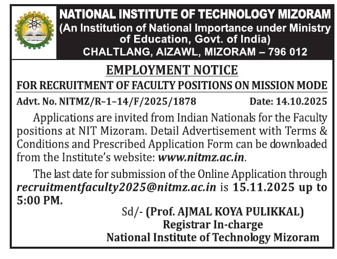Faculty Recruitment 2025 – National Institute of Technology (NIT) Mizoram