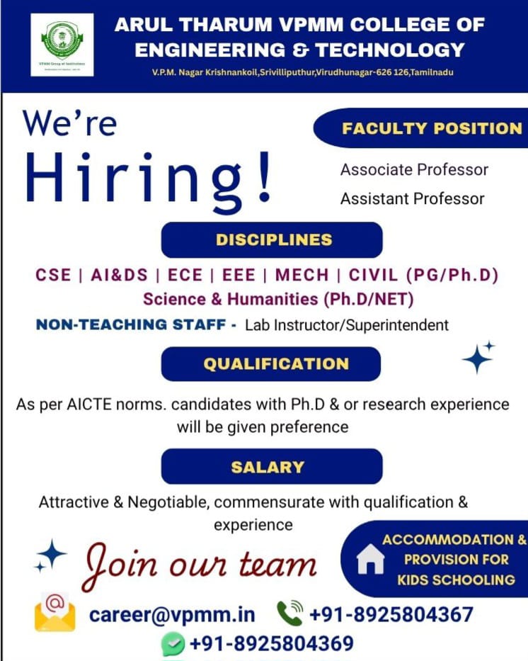 Faculty Recruitment 2025 – VPMM Group of Educational Institutions, Virudhunagar, Tamil Nadu