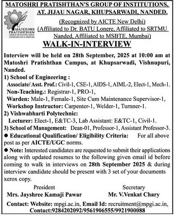 Faculty & Staff Recruitment 2025 | Matoshri Pratishthan Group of Institutions, Nanded.