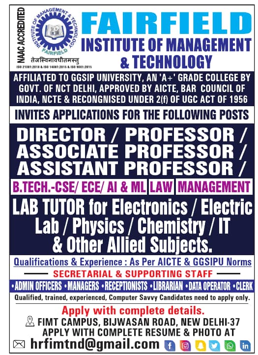 FAIRFIELD INSTITUTE OF MANAGEMENT & TECHNOLOGY, New Delhi – Teaching & Non-Teaching Faculty Recruitment 2025