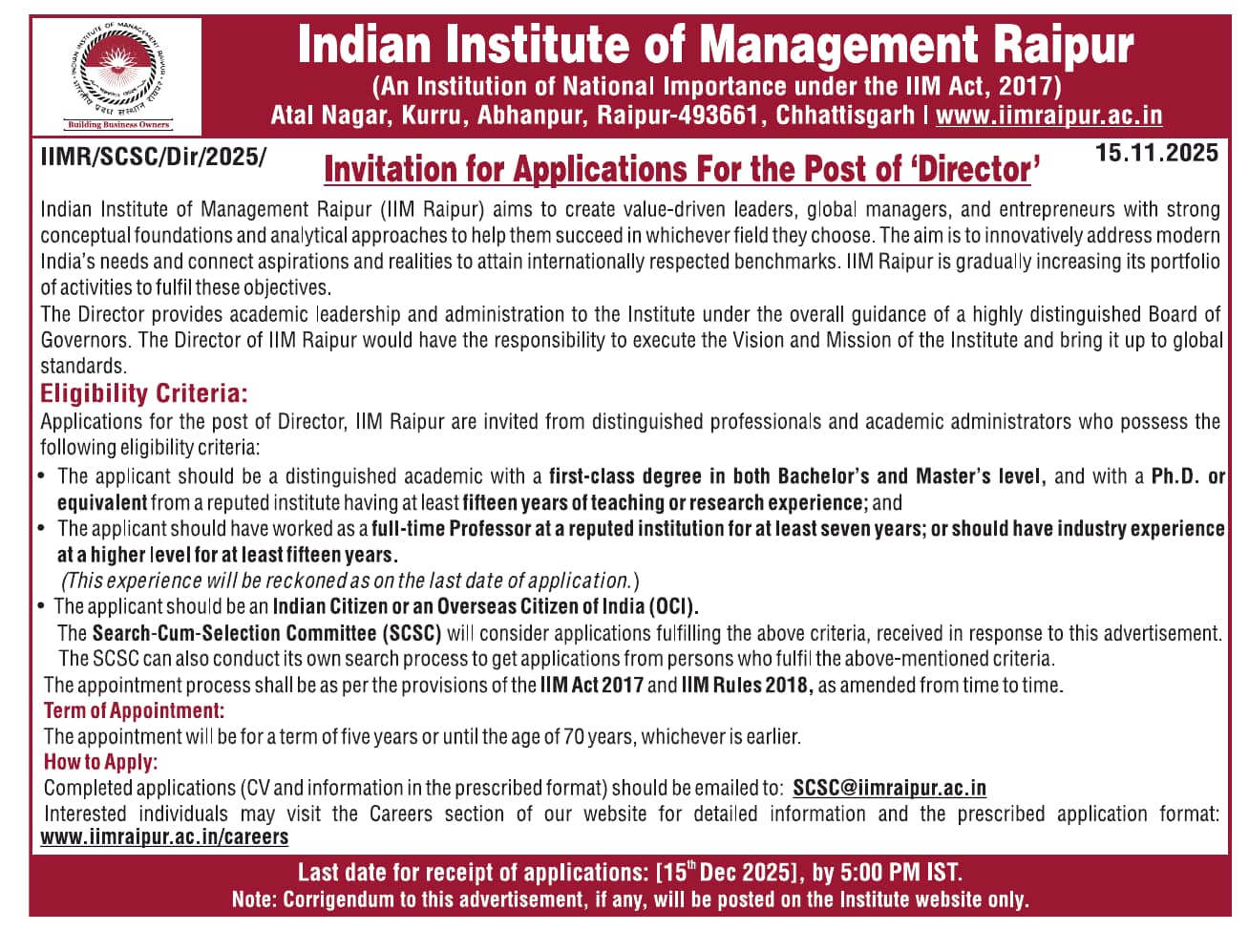 The Indian Institute of Management Raipur (IIM Raipur) invites applications from distinguished professionals and academic administrators for the position of Director for a five-year term. Eligible candidates may apply via email.