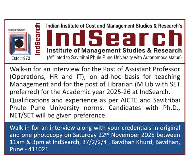 IndSearch Institute of Management Studies & Research, Pune, Maharashtra, has released a Faculty Recruitment 2025–2026 notification. Eligible candidates are invited to attend the Walk-in Interview for Assistant Professor and Librarian positions.