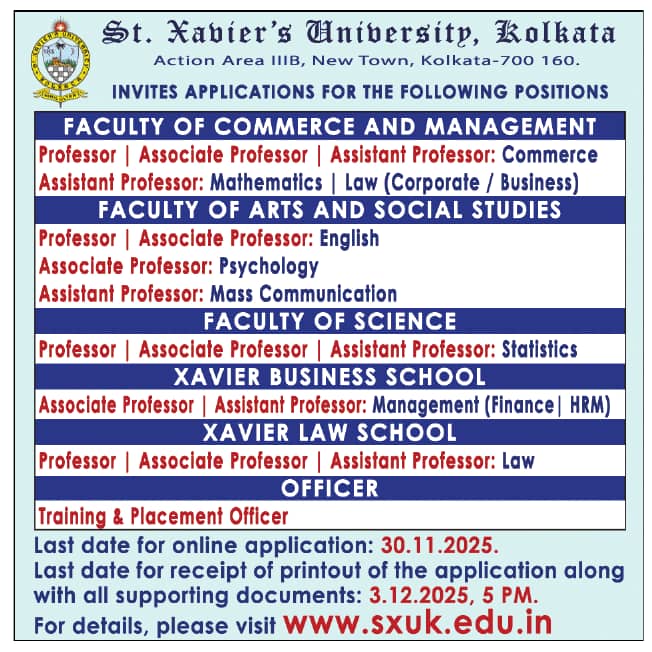 St. Xavier’s University, Kolkata has released an official recruitment notification for Assistant Professor, Associate Professor, Professor, and Training & Placement Officer positions for the 2025–2026 academic year. Eligible and interested candidates are invited to apply through online mode and postal submission.