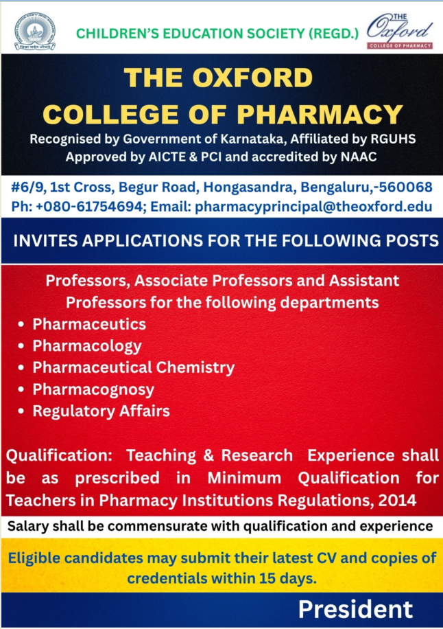 The Oxford College of Pharmacy, one of the premier pharmacy institutions in Karnataka, has announced Immediate Faculty Recruitment for 2025–2026. Eligible and qualified candidates are invited to apply online for various Teaching Positions.