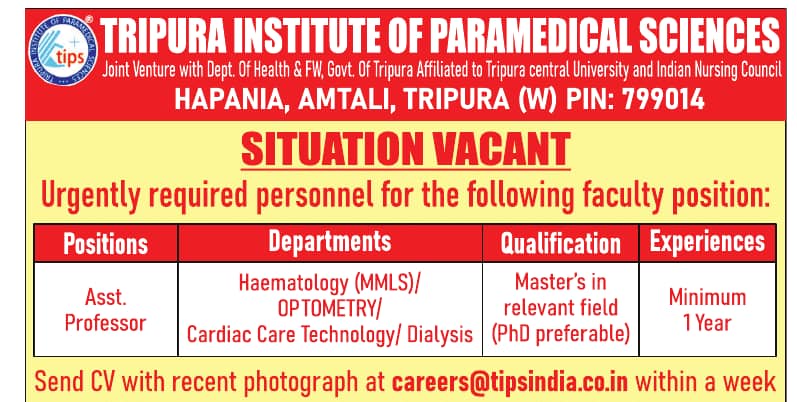 Tripura Institute of Paramedical Sciences, Tripura, invites applications for the post of Assistant Professor for the academic year 2025–2026. Eligible candidates may apply through Email.