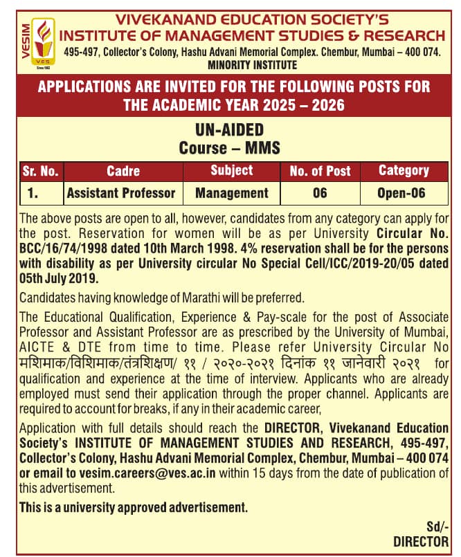 Vivekanand Education Society’s Institute of Management Studies & Research, Mumbai, invites applications for the post of Assistant Professor for the academic year 2025–2026. Eligible candidates may apply by Post or Email within 15 days from the date of advertisement.
